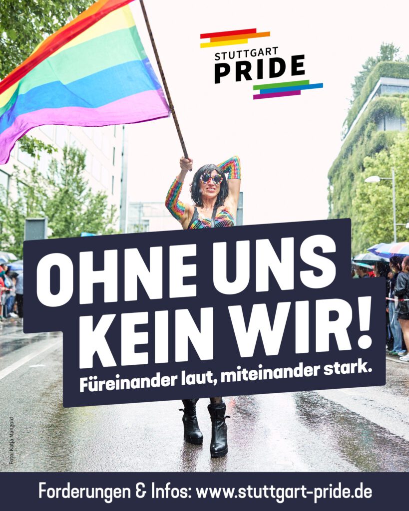 Die Stuttgart PRIDE 2026 steht für Sichtbarkeit, Sicherheit und Entschlossenheit. Wir setzen uns füreinander ein, wenn andere es nicht tun. Wir sind miteinander stark, wenn unsere Rechte infrage gestellt werden. Ohne uns kein wir – und ohne Solidarität keine gerechte Zukunft.