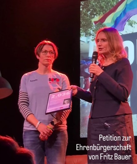 Beim CSD-Neujahresempfang am 23. Januar 2026 im Wizemann Stuttgart konnten die Akteure der online-Unterschriftenaktion „Ehrenbürgerschaft für Fritz Bauer – auch als Vorkämpfer gegen das §175-Unrecht“ der AG Queere Erinnerungskultur „Der-Liebe-wegen“, Kerstin Rudat (LSVD+ Baden-Württemberg), Lars Lindauer (IG CSD Stuttgart), Ralf Bogen (Internetprojekt „Der-Liebe-wegen.org“) und Sven Tröndle (Weissenburg e.V.) 2036 Unterschriften Frau Bürgermeisterin Isabel Fezer (Referat Jugend und Bildung) symbolisch übergeben. Sie bedankten sich bei allen Unterstützenden und appellierten an die Gemeinderäte der Stadt Stuttgart, jetzt ein Zeichen zu setzen und Fritz Bauer eine angemessene Ehrung für sein außerordentliches demokratisches Engagement zuteil werden zu lassen. Zu Fritz Bauer sagten sie (Auszug):